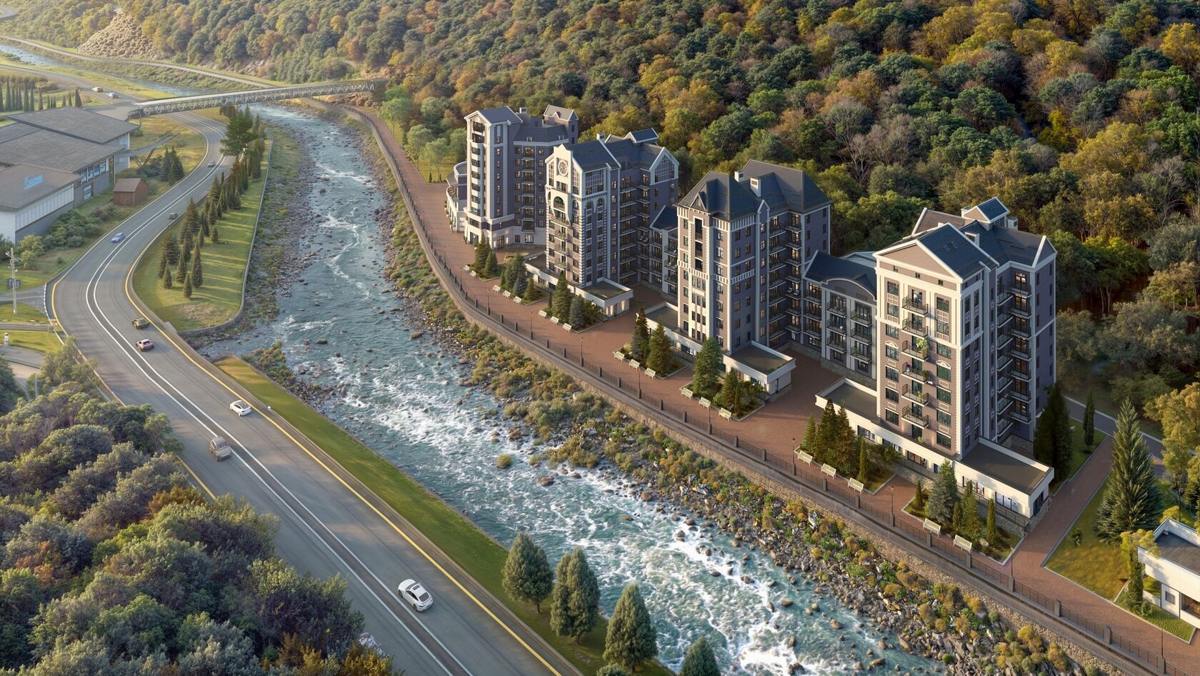 Нередко проекты жилых комплексов обыгрывают окружающий природный ландшафт – например, посадка домов может изображать ущелье, в котором располагаются дома.